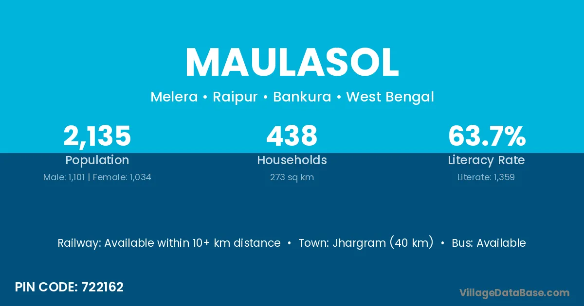 Jhargram (40 km) is the nearest town to Maulasol village for major economic activities and is located approximately 40 km away.