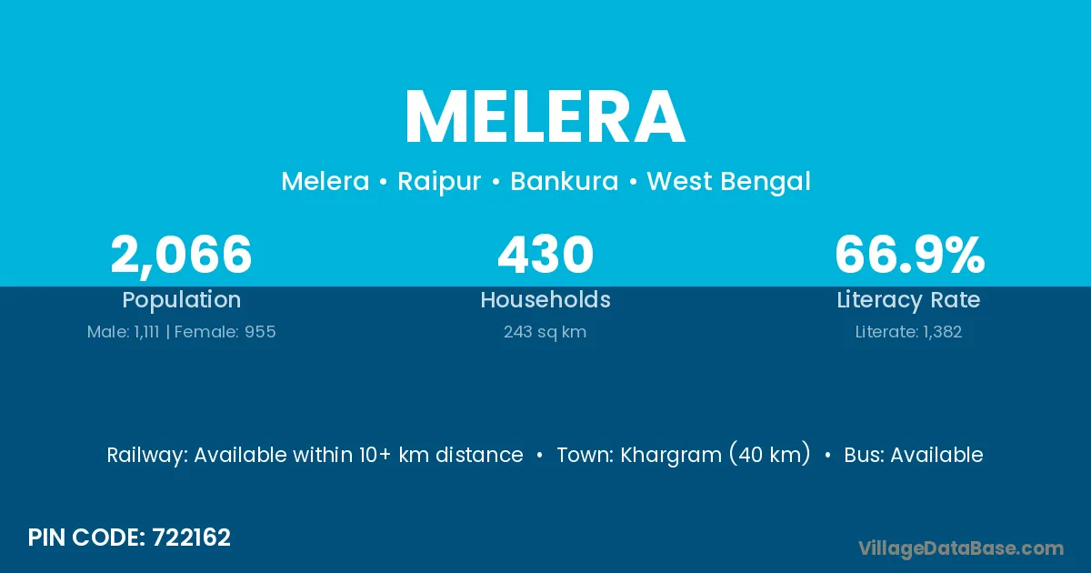 Khargram (40 km) is the nearest town to Melera village for major economic activities and is located approximately 40 km away.