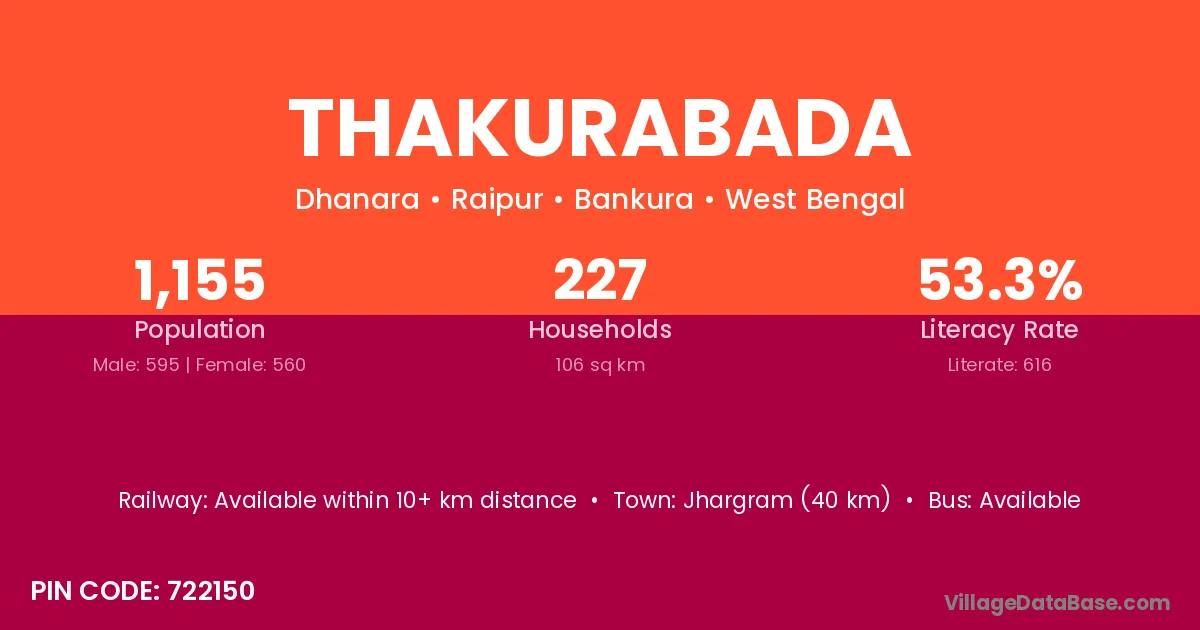 Jhargram (40 km) is the nearest town to Thakurabada village for major economic activities and is located approximately 40 km away.