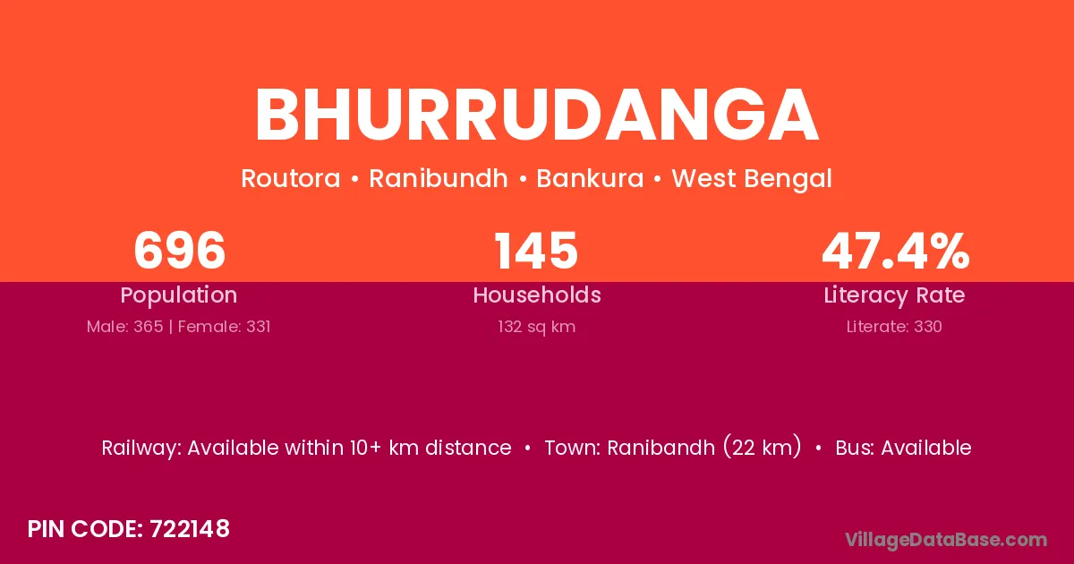 Bhurrudanga village has a total population of 696 people, of which 365 are males and 331 are females.