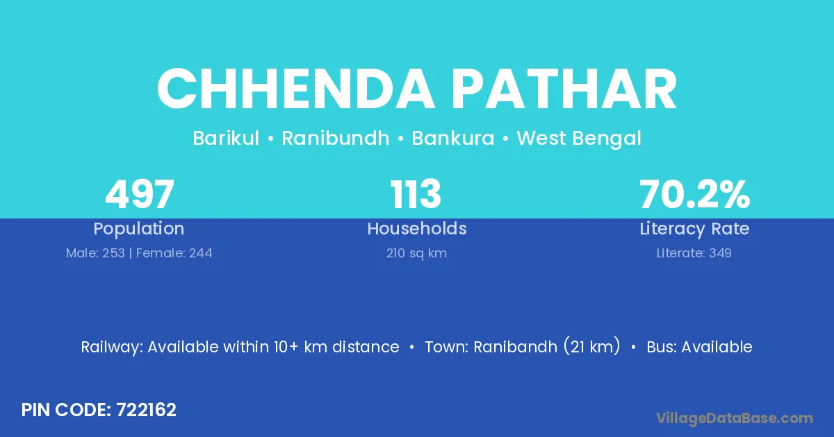 Chhenda Pathar village has a total population of 497 people, of which 253 are males and 244 are females.
