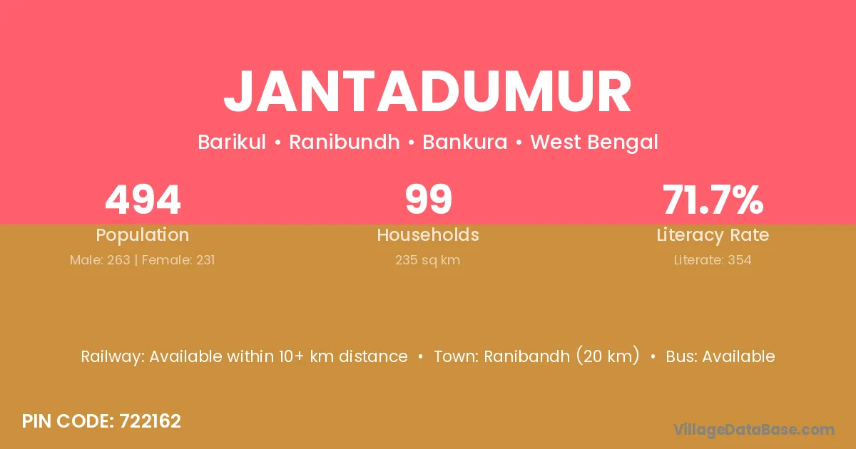Jantadumur village has a total population of 494 people, of which 263 are males and 231 are females.