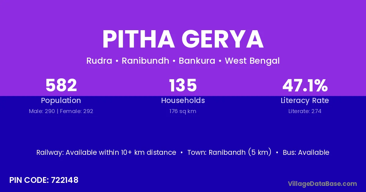 Pitha Gerya village has a total population of 582 people, of which 290 are males and 292 are females.