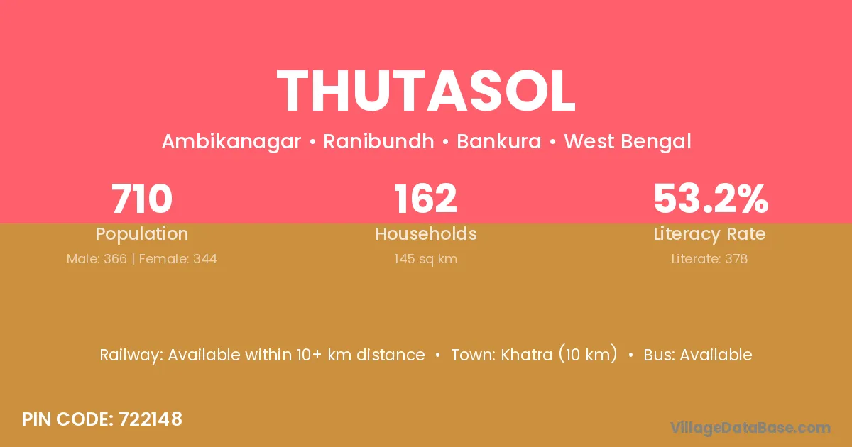 Khatra (10 km) is the nearest town to Thutasol village for major economic activities and is located approximately 10 km away.