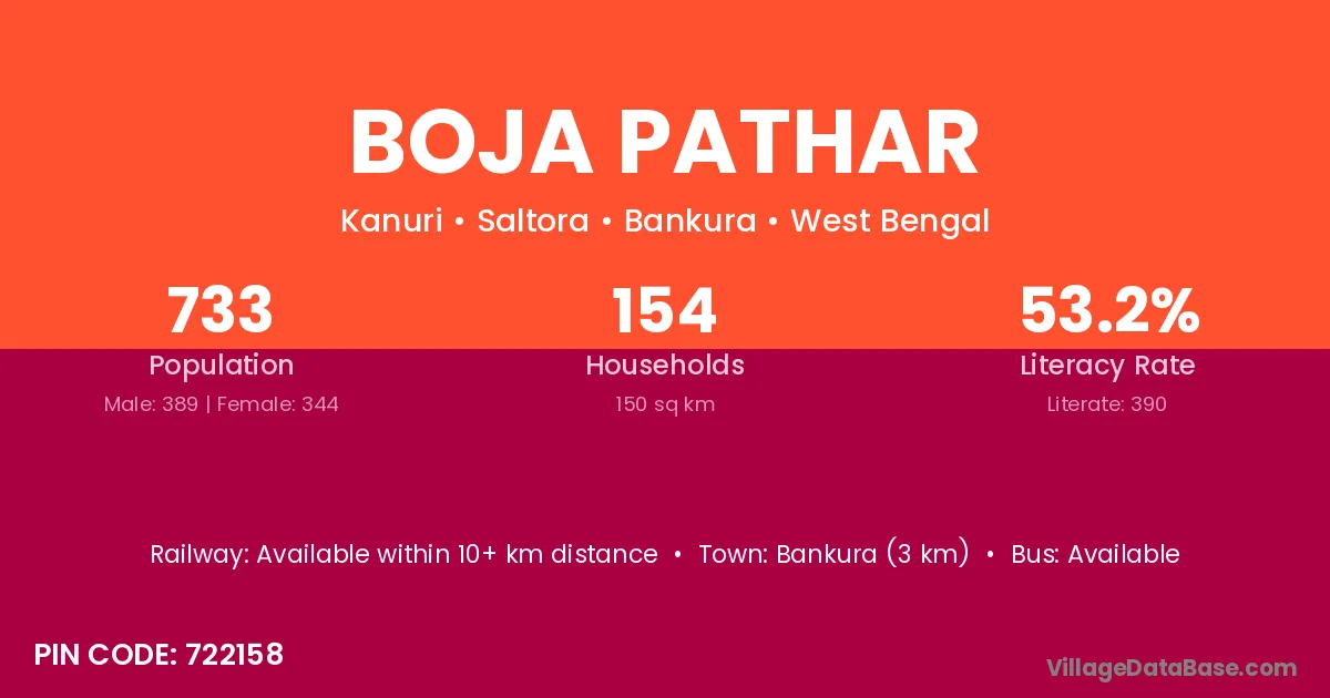 Bankura (3 km) is the nearest town to Boja Pathar village for major economic activities and is located approximately 3 km away.