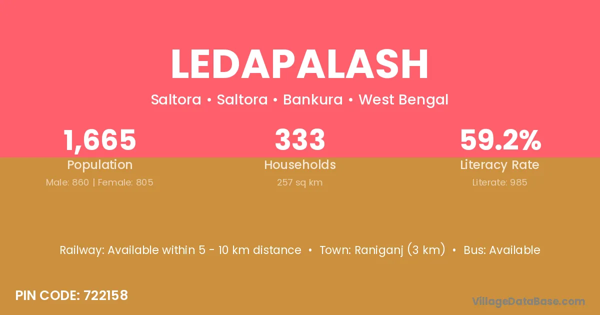 Raniganj (3 km) is the nearest town to Ledapalash village for major economic activities and is located approximately 3 km away.
