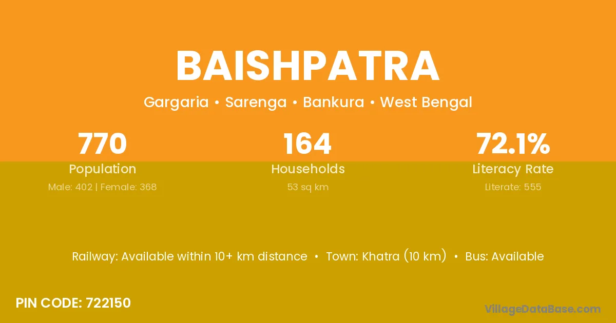 According to Census 2011 information, the village code of Baishpatra village is 722150.
