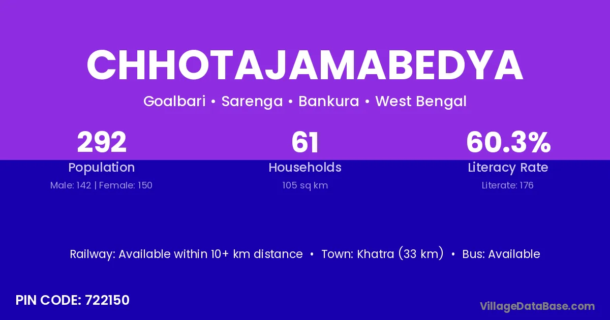 Khatra (33 km) is the nearest town to Chhotajamabedya village for major economic activities and is located approximately 33 km away.