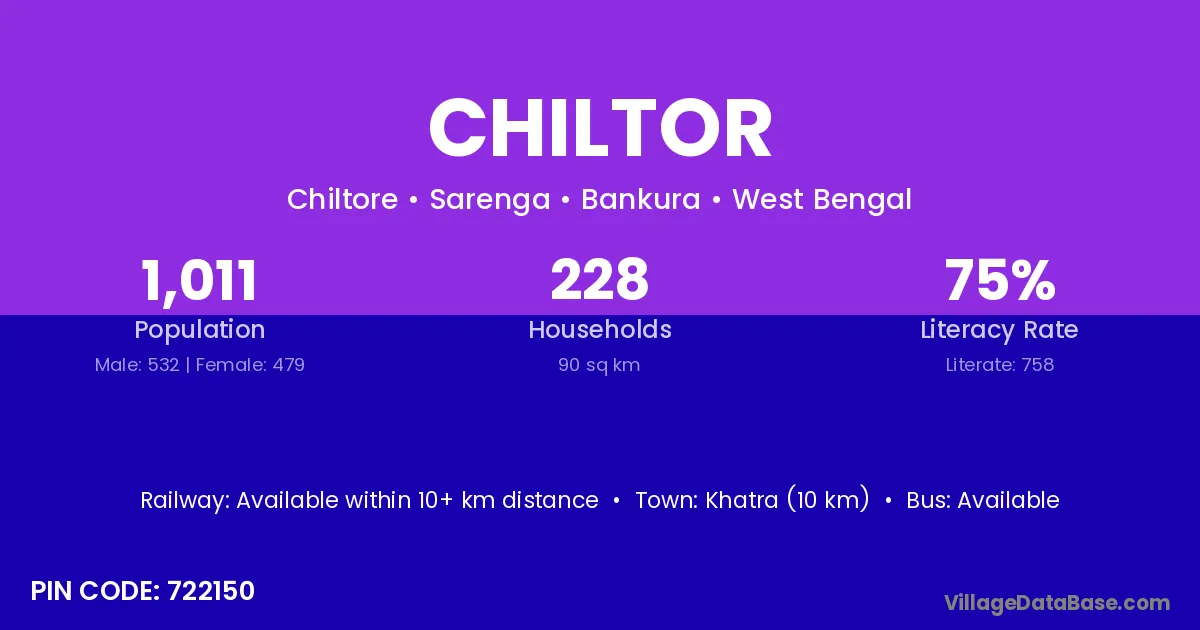 Khatra (10 km) is the nearest town to Chiltor village for major economic activities and is located approximately 10 km away.
