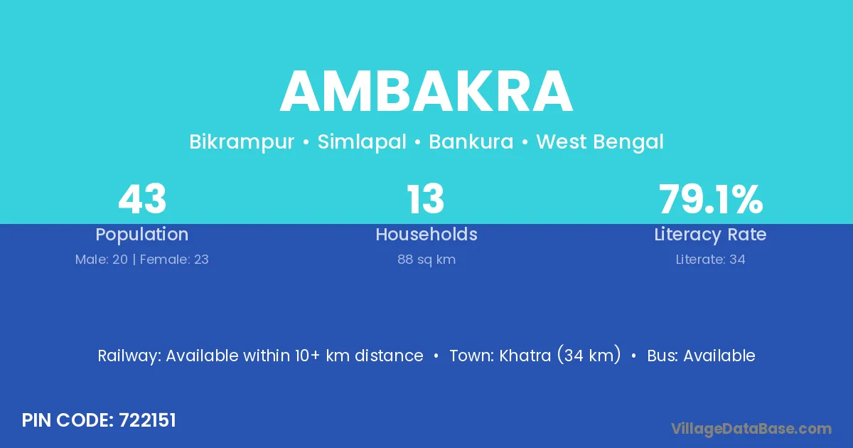 Khatra (34 km) is the nearest town to Ambakra village for major economic activities and is located approximately 34 km away.