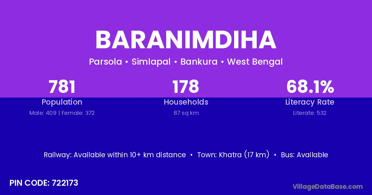 Khatra (17 km) is the nearest town to Baranimdiha village for major economic activities and is located approximately 17 km away.