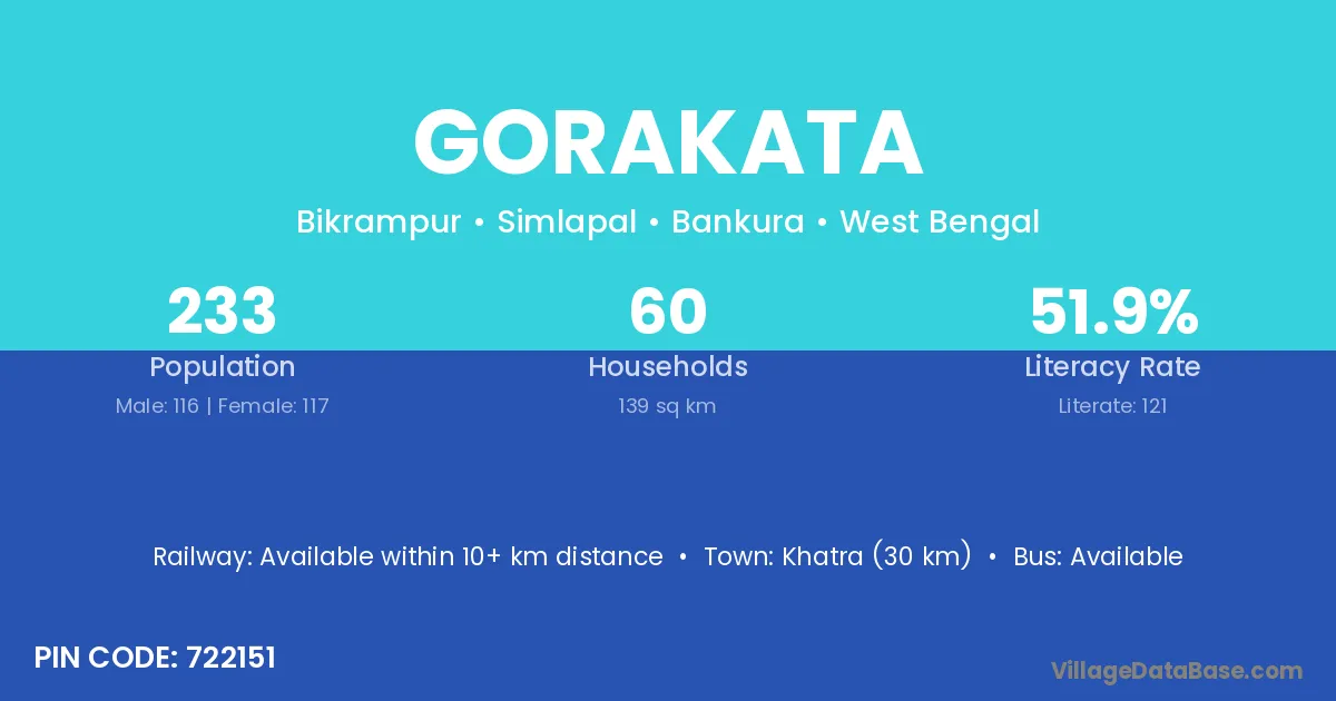 Khatra (30 km) is the nearest town to Gorakata village for major economic activities and is located approximately 30 km away.