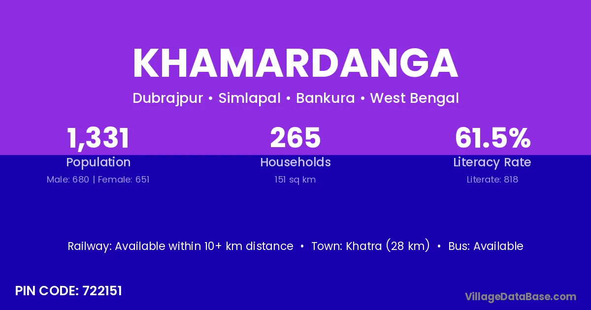 Khatra (28 km) is the nearest town to Khamardanga village for major economic activities and is located approximately 28 km away.
