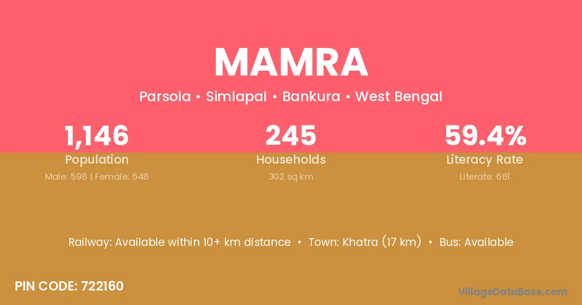 Khatra (17 km) is the nearest town to Mamra village for major economic activities and is located approximately 17 km away.