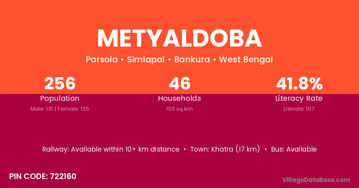 Metyaldoba village has a total population of 256 people, of which 131 are males and 125 are females.