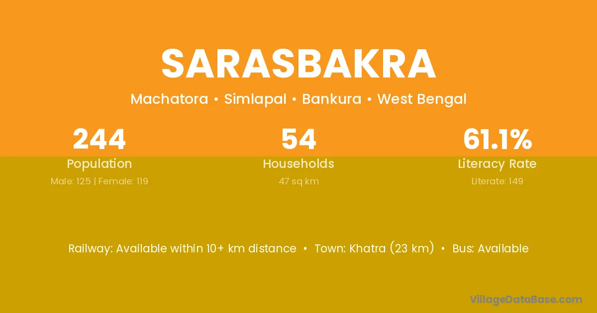 Khatra (23 km) is the nearest town to Sarasbakra village for major economic activities and is located approximately 23 km away.