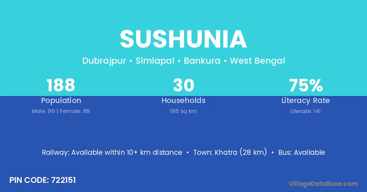 Khatra (28 km) is the nearest town to Sushunia village for major economic activities and is located approximately 28 km away.