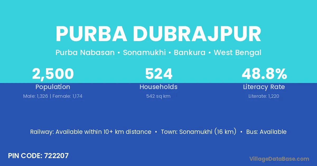 Sonamukhi (16 km) is the nearest town to Purba Dubrajpur village for major economic activities and is located approximately 16 km away.