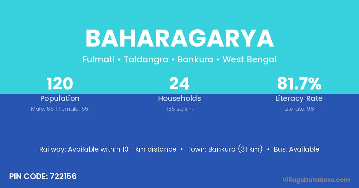 Bankura (31 km) is the nearest town to Baharagarya village for major economic activities and is located approximately 31 km away.