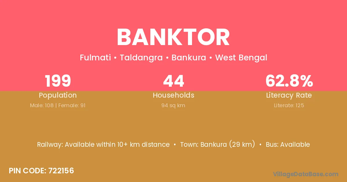 Bankura (29 km) is the nearest town to Banktor village for major economic activities and is located approximately 29 km away.