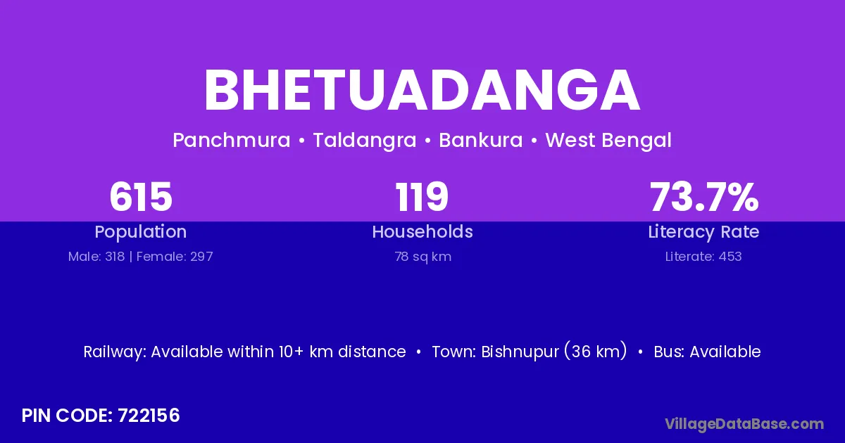 Bishnupur (36 km) is the nearest town to Bhetuadanga village for major economic activities and is located approximately 36 km away.