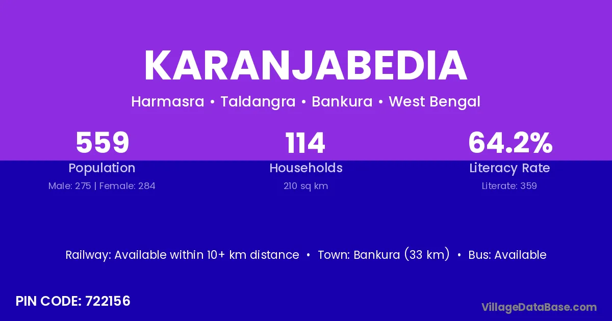 Bankura (33 km) is the nearest town to Karanjabedia village for major economic activities and is located approximately 33 km away.