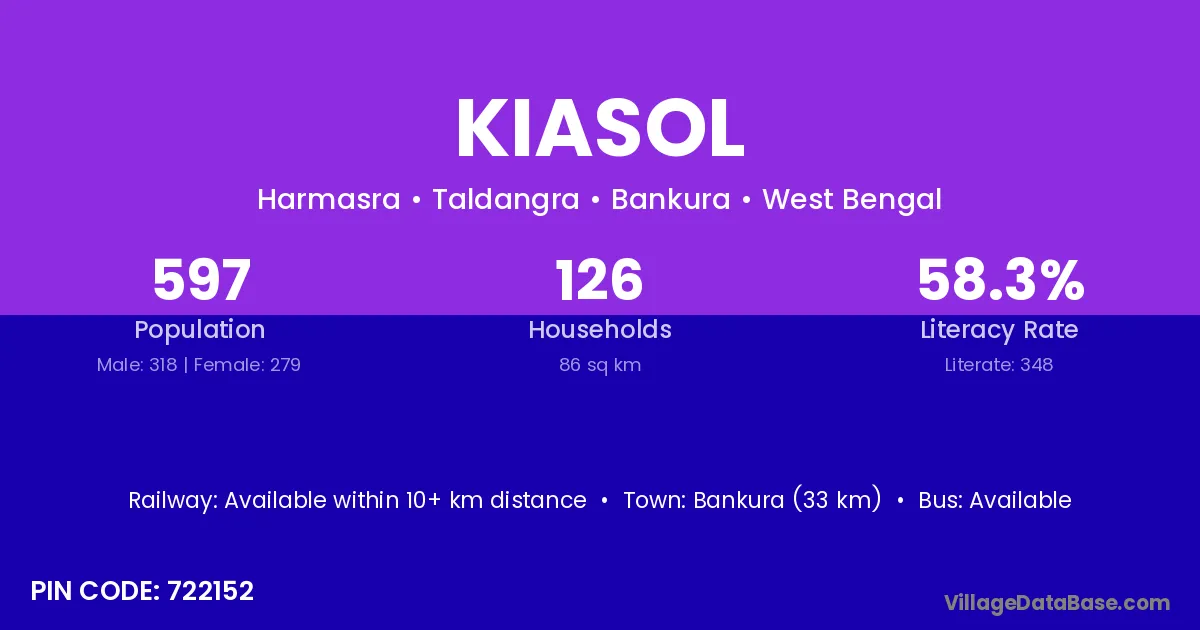 Bankura (33 km) is the nearest town to Kiasol village for major economic activities and is located approximately 33 km away.