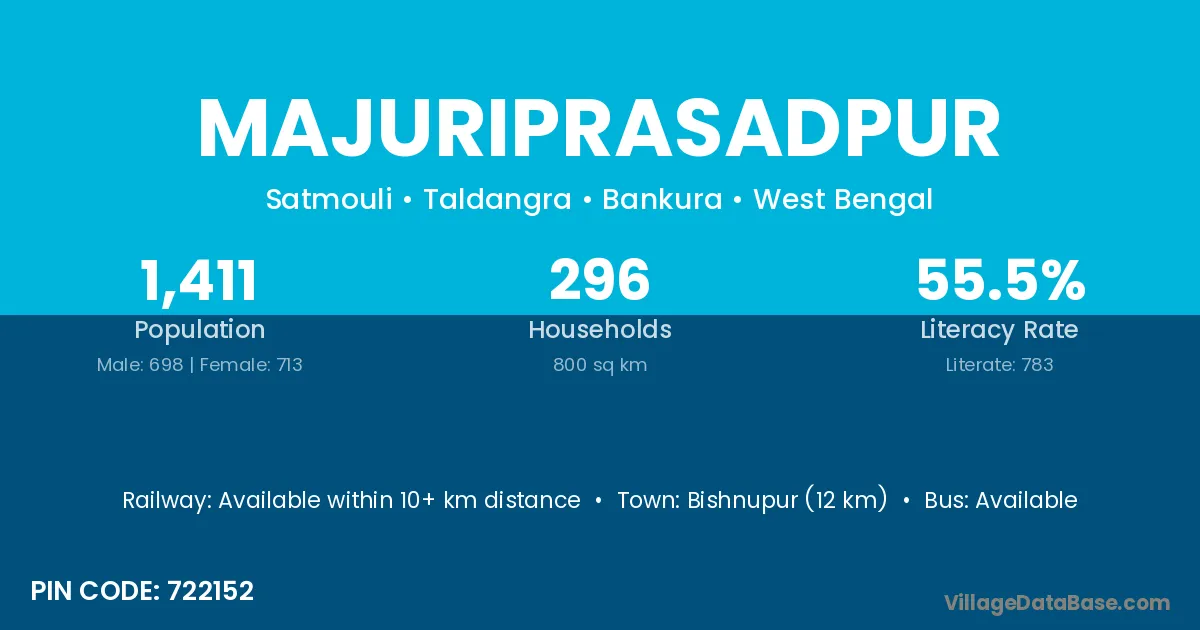 Bishnupur (12 km) is the nearest town to Majuriprasadpur village for major economic activities and is located approximately 12 km away.