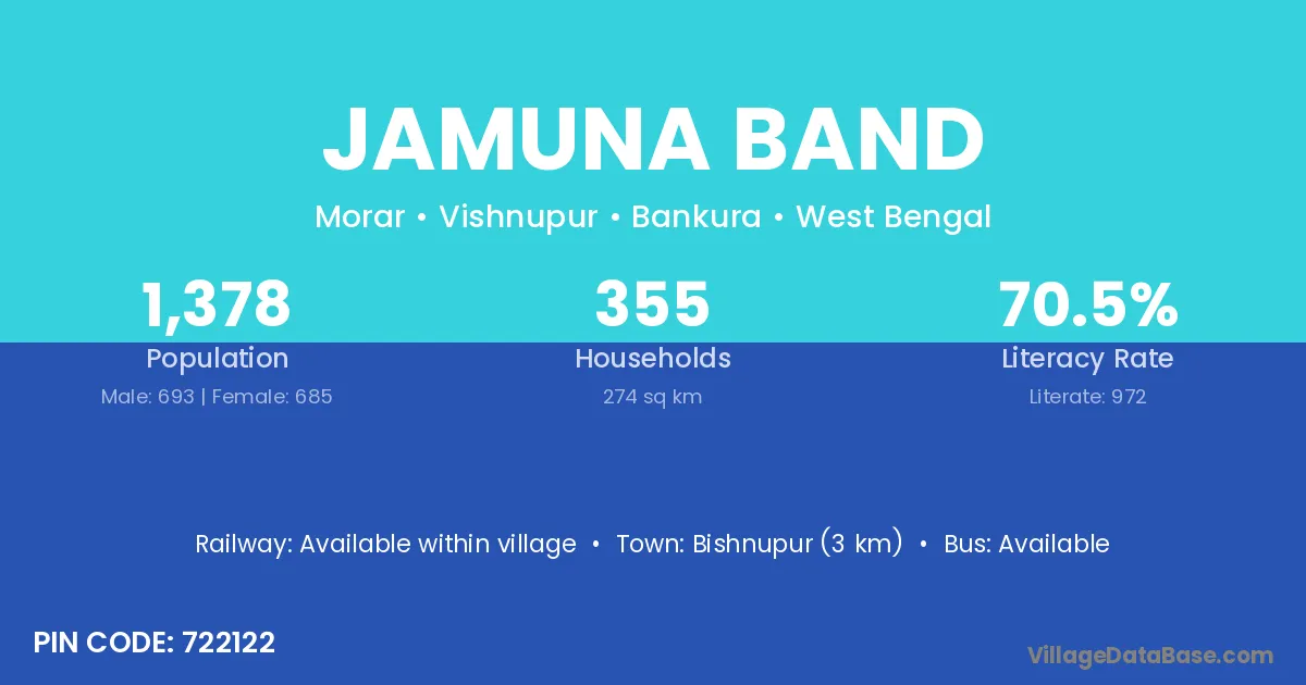 Bishnupur (3 km) is the nearest town to Jamuna Band village for major economic activities and is located approximately 3 km away.
