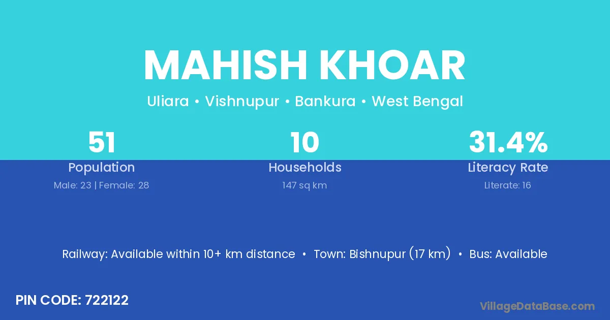 Bishnupur (17 km) is the nearest town to Mahish Khoar village for major economic activities and is located approximately 17 km away.