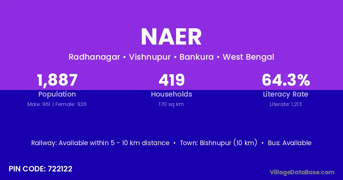 Bishnupur (10 km) is the nearest town to Naer village for major economic activities and is located approximately 10 km away.
