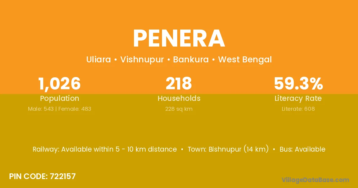 Bishnupur (14 km) is the nearest town to Penera village for major economic activities and is located approximately 14 km away.