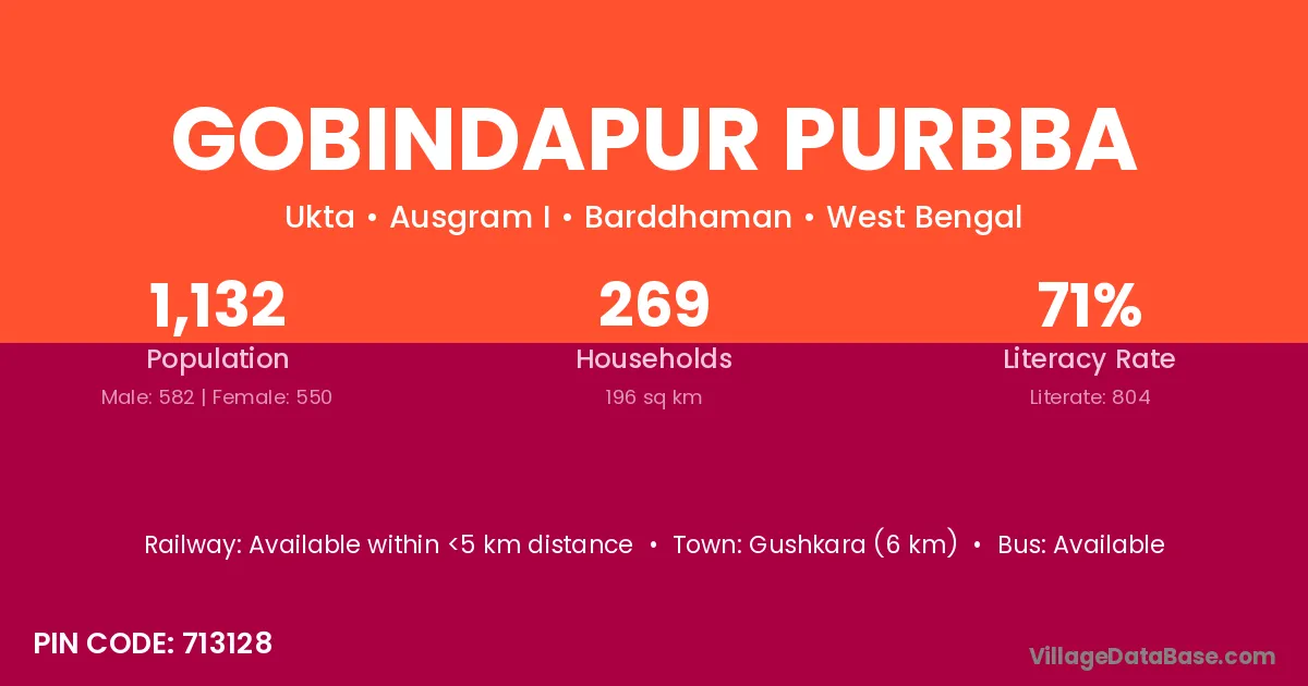 Gushkara (6 km) is the nearest town to Gobindapur Purbba village for major economic activities and is located approximately 6 km away.