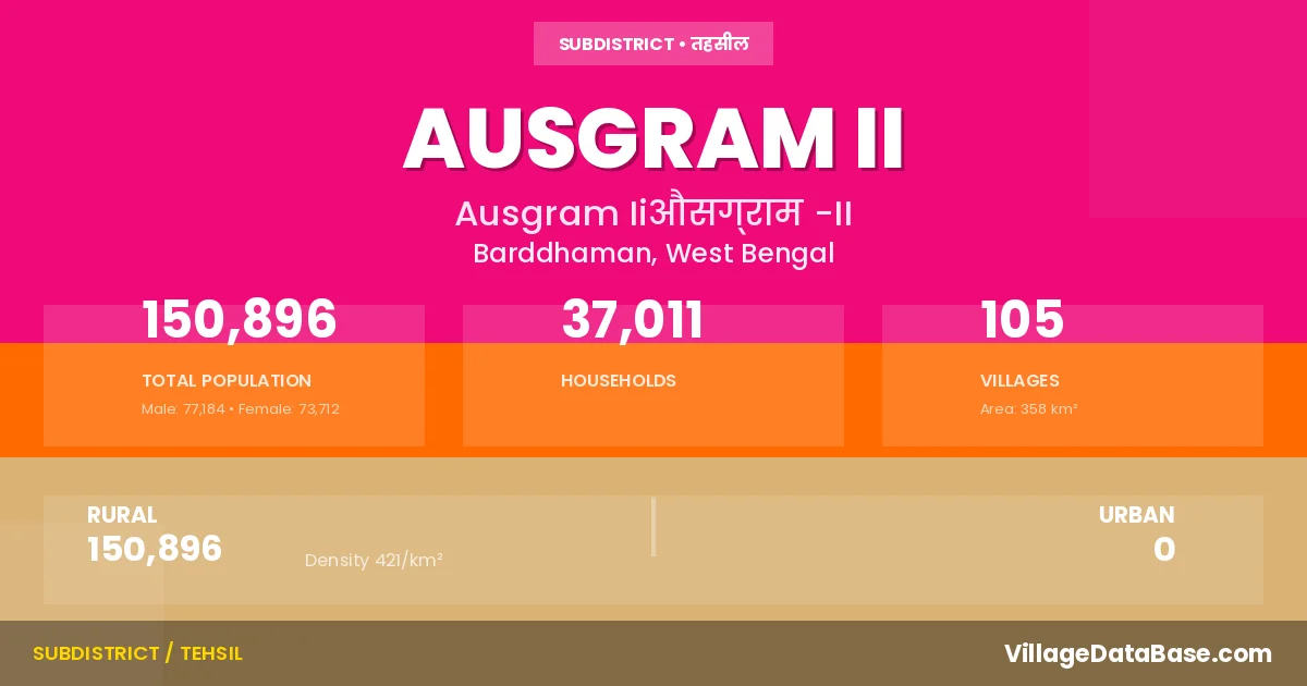 According to the 2011 census The total area of Ausgram II Subdivision is 358 km², with a population of 150896 people. The population density is 421 inhabitants per square kilometre, and there are approximately 37011 houses in the sub district.