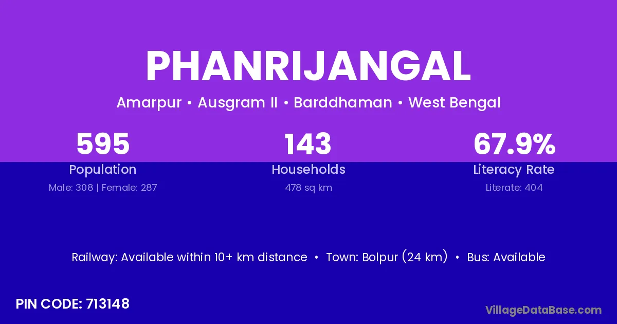 Bolpur (24 km) is the nearest town to Phanrijangal village for major economic activities and is located approximately 24 km away.