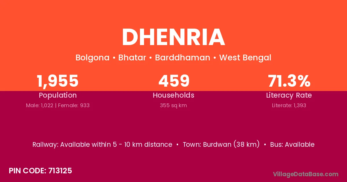 Burdwan (38 km) is the nearest town to Dhenria village for major economic activities and is located approximately 38 km away.