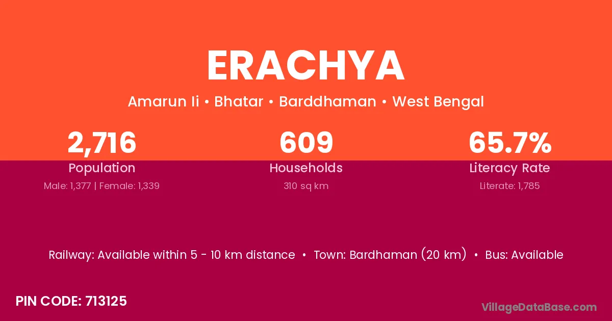 Bardhaman (20 km) is the nearest town to Erachya village for major economic activities and is located approximately 20 km away.