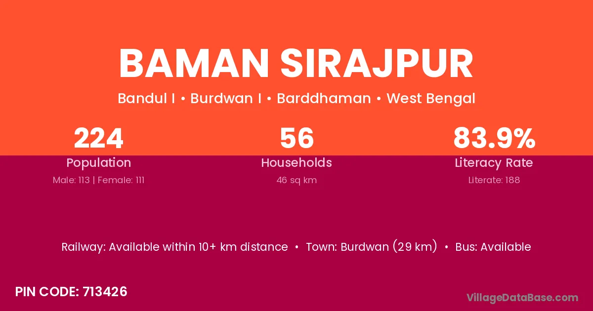 Burdwan (29 km) is the nearest town to Baman Sirajpur village for major economic activities and is located approximately 29 km away.