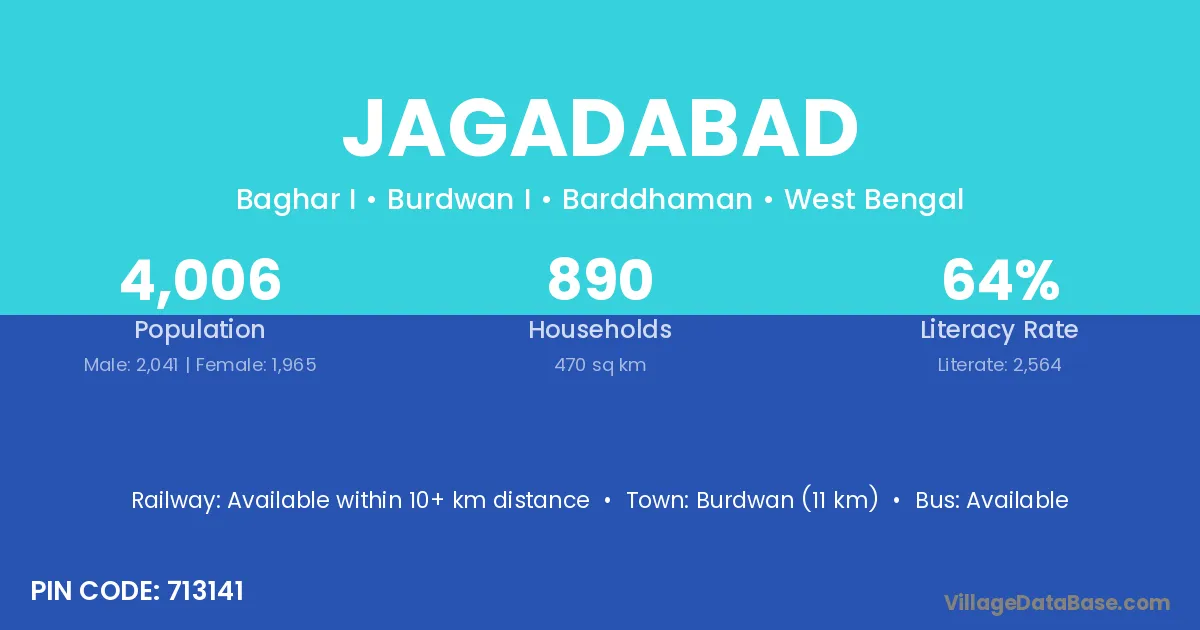 Burdwan (11 km) is the nearest town to Jagadabad village for major economic activities and is located approximately 11 km away.