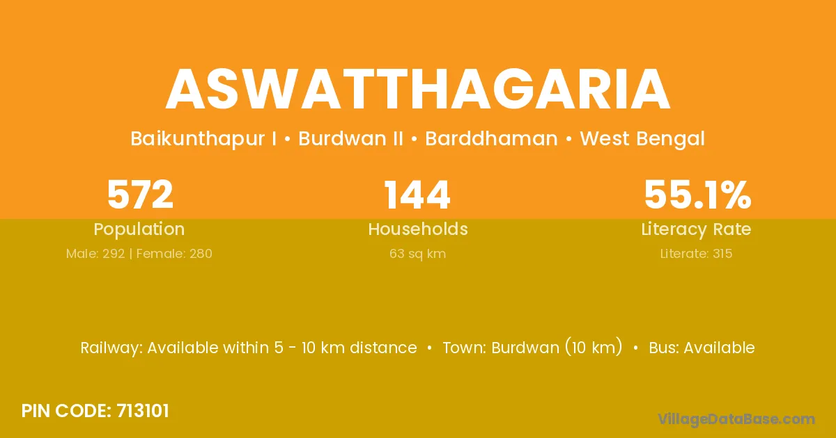 Burdwan (10 km) is the nearest town to Aswatthagaria village for major economic activities and is located approximately 10 km away.