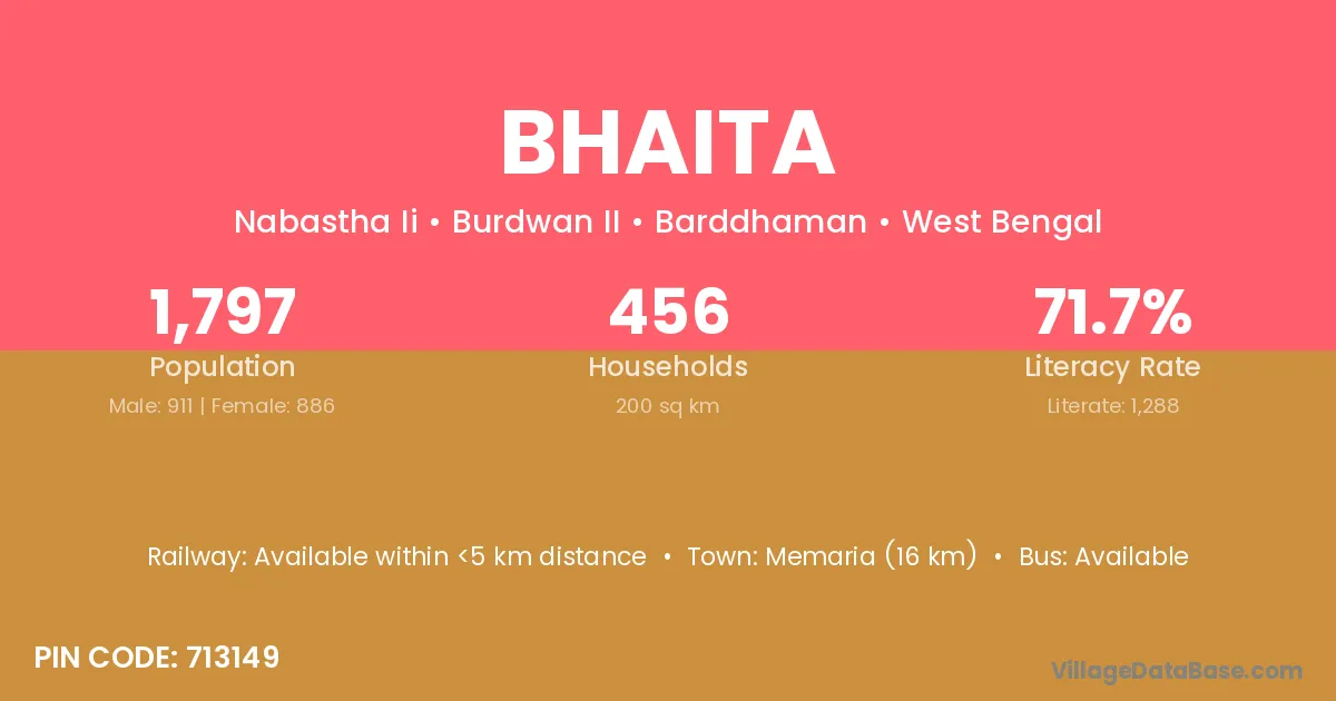 Memaria (16 km) is the nearest town to Bhaita village for major economic activities and is located approximately 16 km away.
