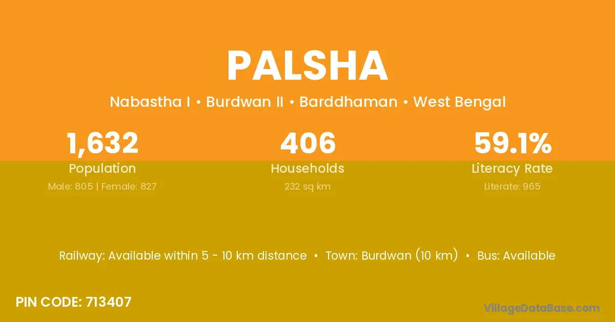 Burdwan (10 km) is the nearest town to Palsha village for major economic activities and is located approximately 10 km away.