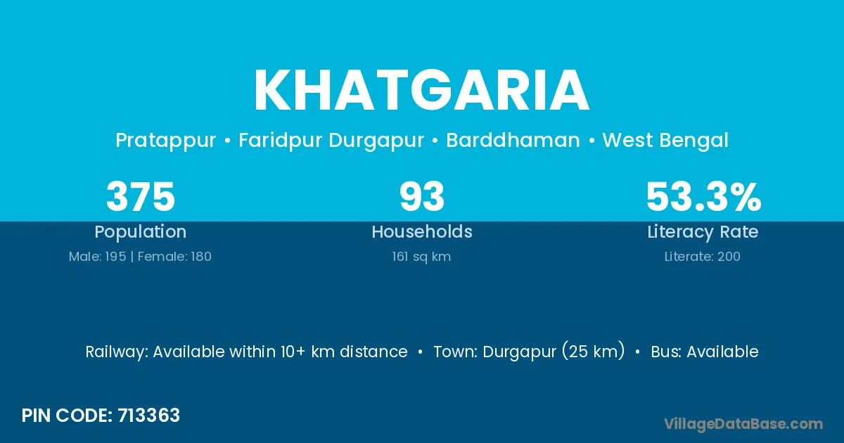 Durgapur (25 km) is the nearest town to Khatgaria village for major economic activities and is located approximately 25 km away.