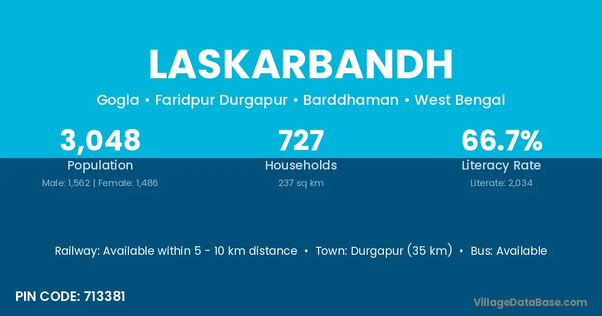 Durgapur (35 km) is the nearest town to Laskarbandh village for major economic activities and is located approximately 35 km away.
