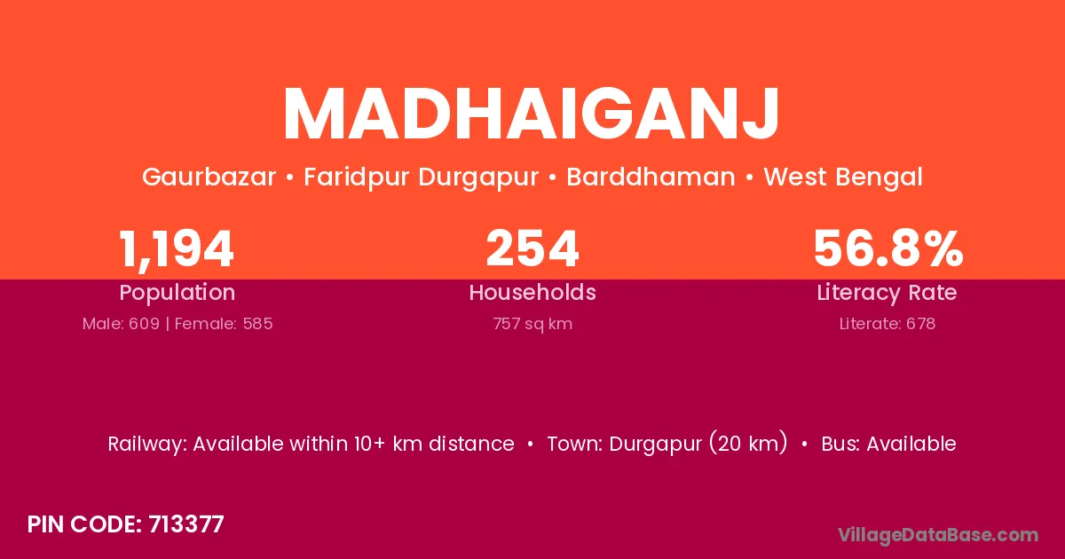 Durgapur (20 km) is the nearest town to Madhaiganj village for major economic activities and is located approximately 20 km away.