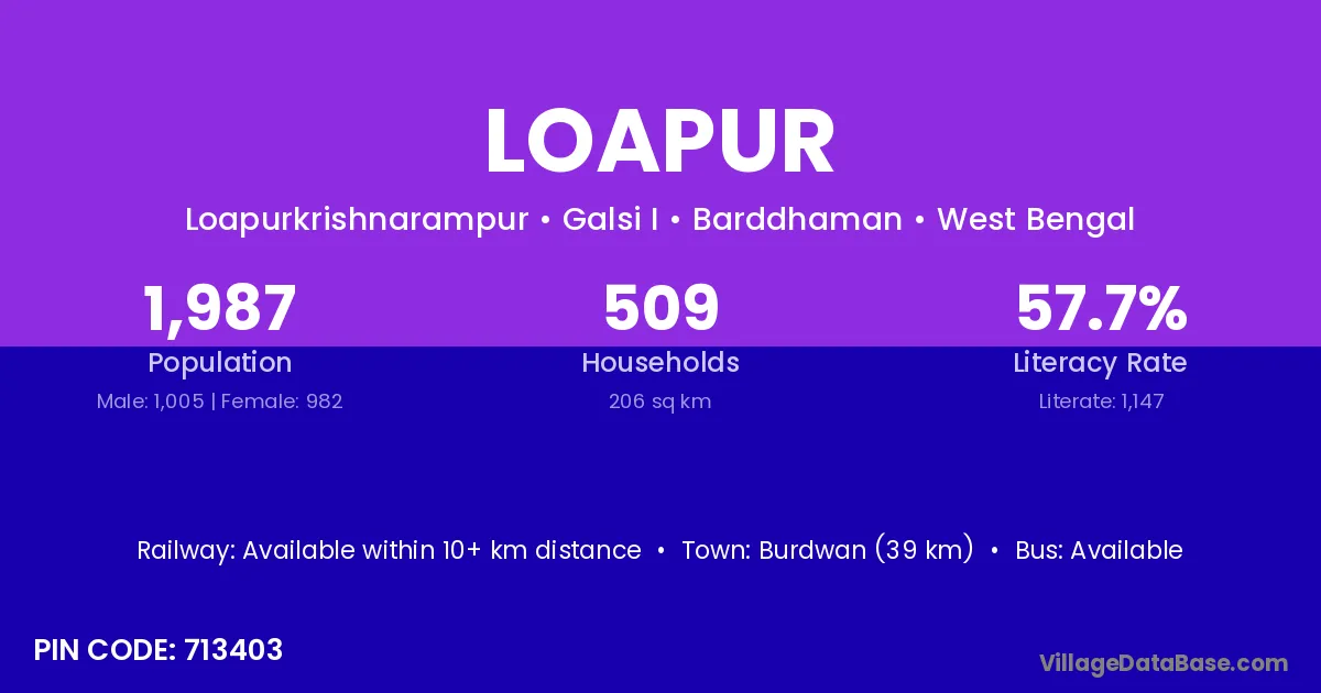 Burdwan (39 km) is the nearest town to Loapur village for major economic activities and is located approximately 39 km away.