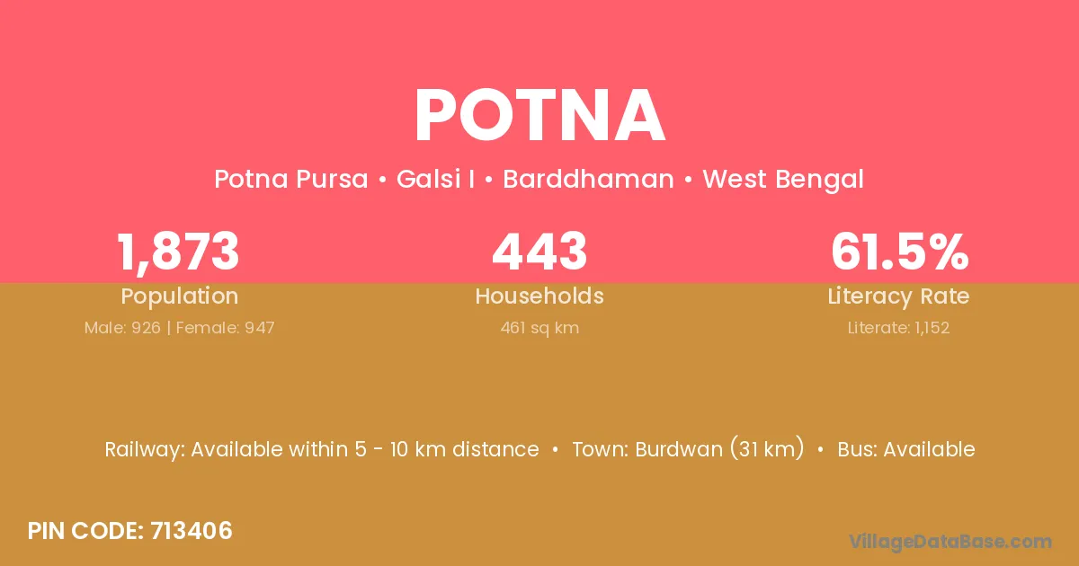 Burdwan (31 km) is the nearest town to Potna village for major economic activities and is located approximately 31 km away.