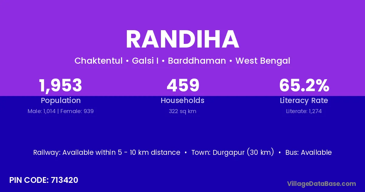 Durgapur (30 km) is the nearest town to Randiha village for major economic activities and is located approximately 30 km away.