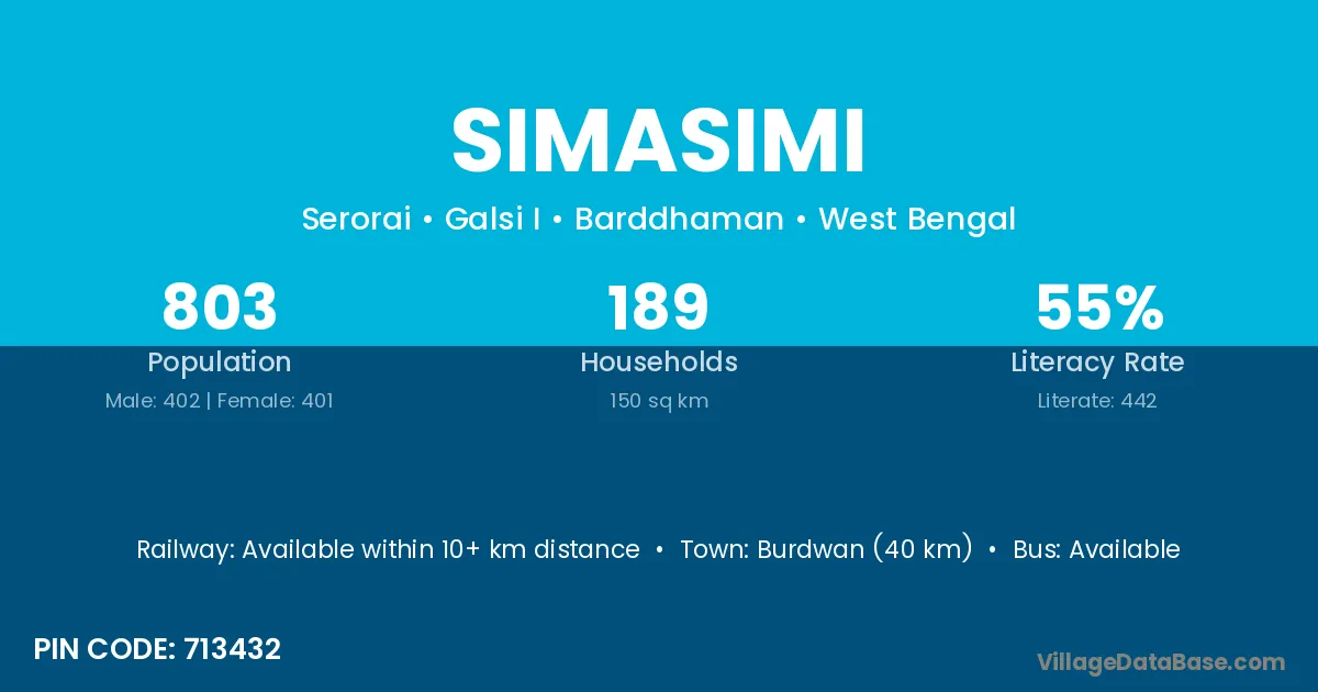 Burdwan (40 km) is the nearest town to Simasimi village for major economic activities and is located approximately 40 km away.