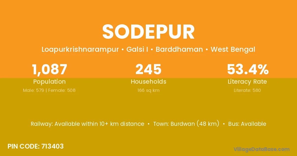 Burdwan (48 km) is the nearest town to Sodepur village for major economic activities and is located approximately 48 km away.